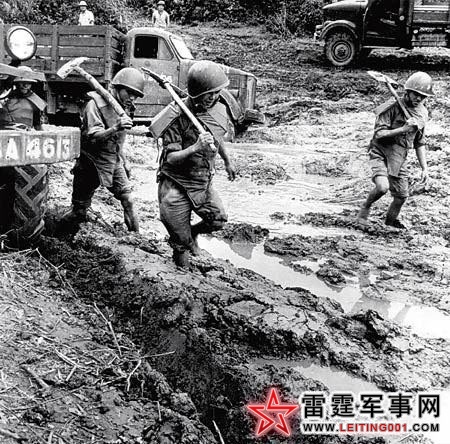 越南人民军工兵正试图使胡志明小道泥泞里的卡车恢复自由,胡志明小道常年暴雨不断(有时是美军的人工降雨)加上美军不间断的轰炸,道路状况极其恶劣。(1966)