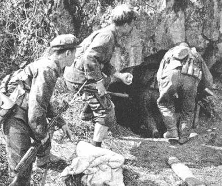 这是越军的一个机枪工事,敌人企图依托较强的火力阻止我突击队攻击前进。马占福依靠娴熟的单兵战术动作,三滚两跃就到了工事跟前,迅速将炸药包投了进去。只听一声巨响,洞内三名敌人和机枪一起飞上了天。马占福顾不上高兴,又继续向前冲去。